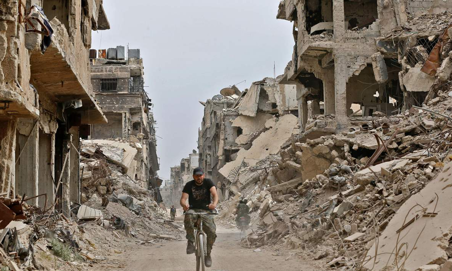شاب يقود دراجته في شارع مدمر من شوارع مخيم "اليرموك" جنوبي دمشق- 23 من نيسان 2019 (AFP\ لؤي بشارة)