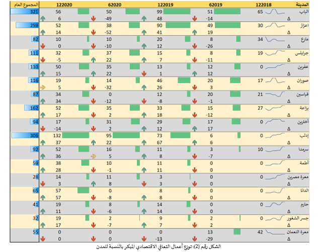 وغابت العديد من البلدات والمدن في العام 2018 و2019، لكنها شهدت نشاطاً أكثر في قطاعات عدة، كما في سرمدا والدانا ومعرة مصرين وحارم وأطمة، بفضل أعمال قطاع المياه والنقل والنزوح الداخلي. فيما اختفت مدن من المؤشر لاحقاً بعد سيطرة النظام على بلدات ومدن عدة في جنوب إدلب، مثل معرة النعمان وسراقب.