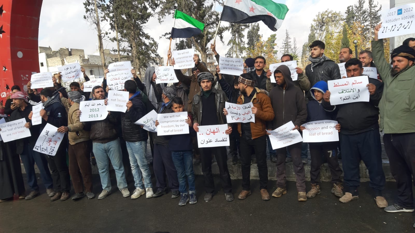 ونظّم المتظاهرون، وقفة تحت اسم “العزة والكرامة” وتجمّعوا في ساحة “السنتر” قرب الحديقة العامة وسط مدينة الباب، احتجاجاً وتنديداً بارتفاع سعر مادة الخبز وغلاء المواد التموينية.