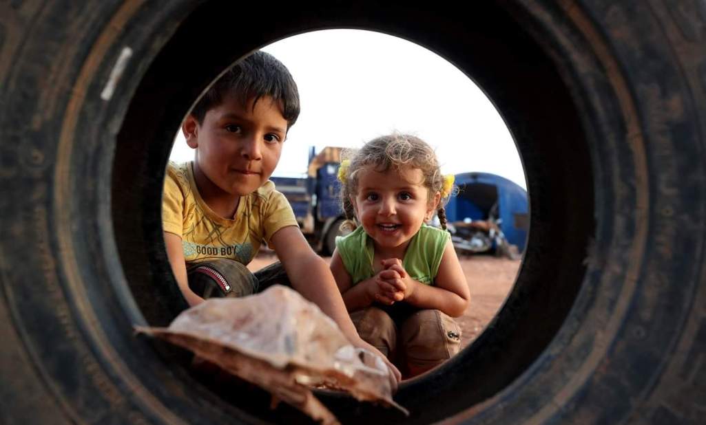 أطفال سوريون يلعبون بإطار في مخيم للنازحين في مدينة معرة مصرين بمحافظة إدلب شمال غربي سوريا- 8 من أيار 2021 (AFP/ عمر الحاج قدور)