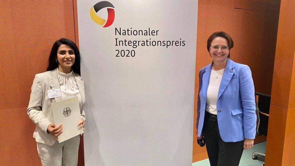 منحت الحكومة الألمانية، المهاجرة السورية بجين الحسن الجائزة الوطنية للاندماج لعام 2020، بحضور المستشارة أنغيلا ميركل.