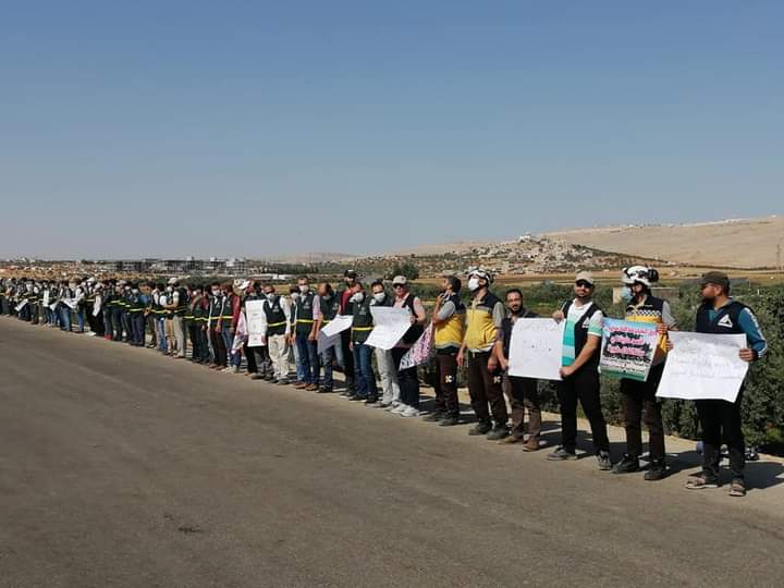 أقام متطوعون من الخوذ البيضاء وكوادر طبية وعاملون في المجال الإنساني، اليوم الجمعة سلسلة بشرية على طريق معبر باب الهوى في ريف إدلب الشمالي، للمطالبة بتمديد آلية تفويض إدخال المساعدات الإنسانية إلى سوريا عبر الحدود.