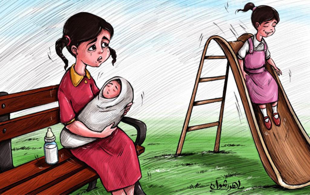 نهال الحامل في شهرها الخامس اليوم، تحاول أن تخبئ دمعتها وهي تتحدث عن ألم يعتريها “لا أستطيع تحمل طلبات زوجي، فهو يطالبني دوماً بممارسة حياتي الزوجية معه، اغتصبني عدة مرات، وها أنا الآن حامل، يخطر ببالي كثيراً أن أذهب إلى المدرسة، وأن أتعلم، أن أنزل إلى الشارع، وألعب مع البنات هناك، أن أعيش طفولتي التي كانت خالتي تخبرني عنها، لكن لا أستطيع، فزوجي لا يدعني أخرج من المنزل بمفردي، وعندما يذهب يقفل باب المنزل، أبقى وحيدة، دون أي اهتمام منه أو حتى من والدتي”.