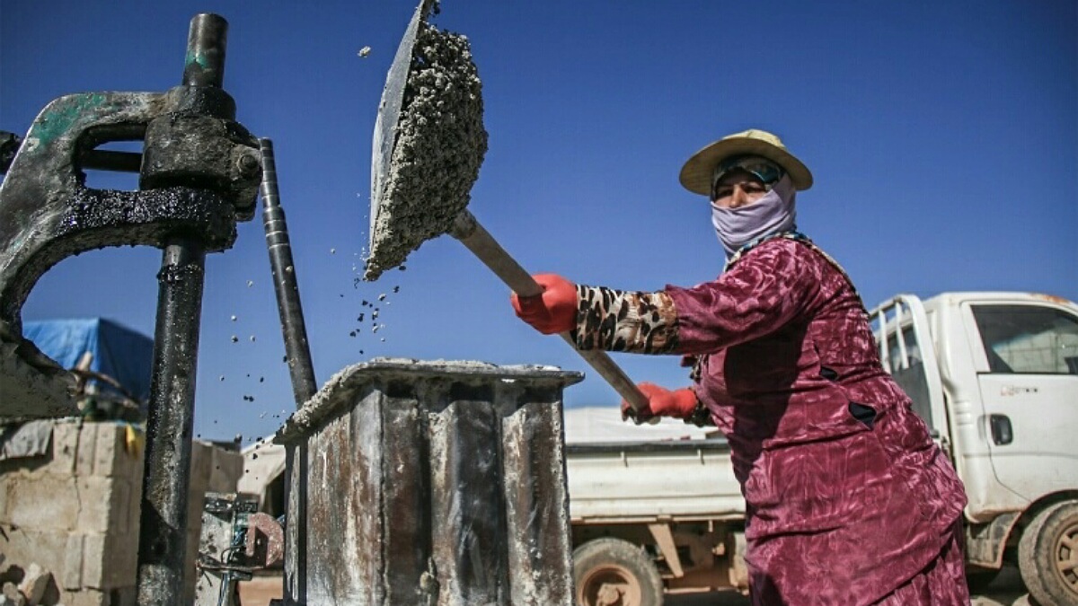 بهمة وإصرار كبير تنقل الثلاثينية السورية كريمة الشيخ الإسمنت والحصى من الأرض إلى مكبس صناعة الطوب مستخدمة عصا الكريك، قبل الضغط على المكبس وإخراج قالب الطوب ورصفه مع أقرانه، في مشهد غير مألوف لامرأة في سوريا التي مزقتها الحرب وأنهك سكانها الغلاء ونقص المؤن.